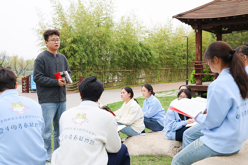 草坪上,校团委首场读书分享会打破传统会议模式,团员青年围坐一圈,在微风绿意中开启沉浸式学习。校团委学生副书记梁佳超同学以 “小小道钉,大大梦想” 为切入点,带领大家重温青年习近平在梁家河的七年知青岁月,生动讲述过 “四关” 的成长蜕变,以及创办铁业社、修建沼气池、打坝挖井等为民办实事的故事。活动中,全体人员共同学习习近平总书记对青年的殷切寄语,牢记 “有理想、敢担当、能吃苦、肯奋斗” 的时代要求。自由交流环节,青年代表结合学习与团学工作踊跃发言,在思想碰撞中凝聚青春共识,展现交院青年昂扬向上的精神风貌。