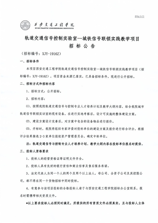 WilliamHill中文官方网站轨道交通信号控制实验室—城铁信号联锁实践教学项目招标公告