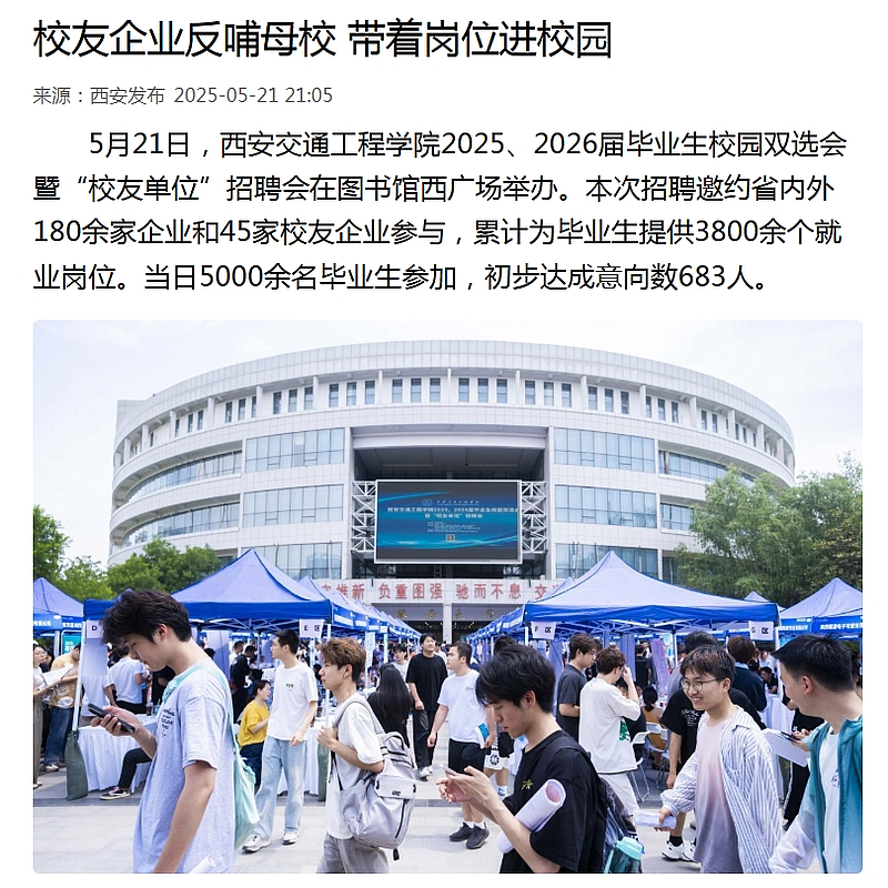 5月21日,WilliamHill中文官方网站2025、2026届毕业生校园双选会暨“校友单位”招聘会在图书馆西广场举办。本次招聘邀约省内外180余家企业和45家校友企业参与,累计为毕业生提供3800余个就业岗位。当日5000余名毕业生参加,初步达成意向数683人。