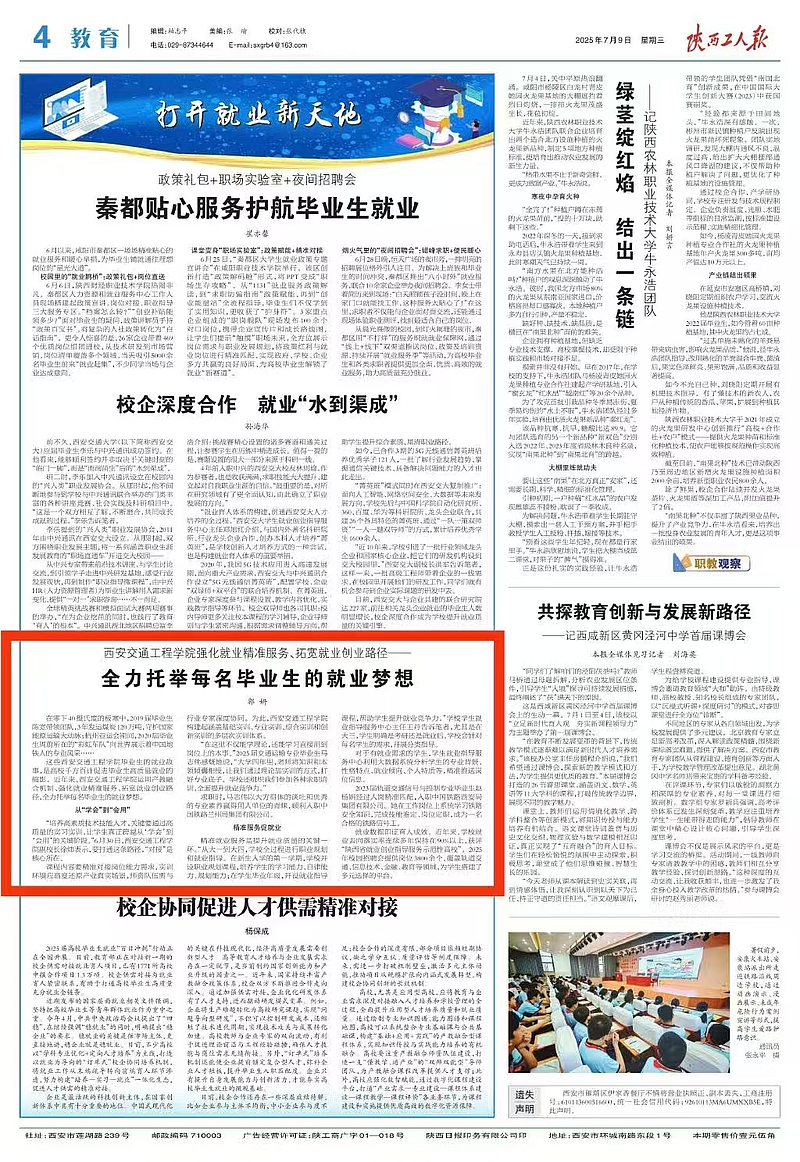 就业数据印证育人成效。近年来,学校就业去向落实率连续多年保持在90%以上,获评“陕西省就业创业指导服务示范性高校”。2025年校园招聘会提供岗位3800余个,覆盖轨道交通、信息技术、金融、教育等领域,为学生搭建了多元选择的平台。