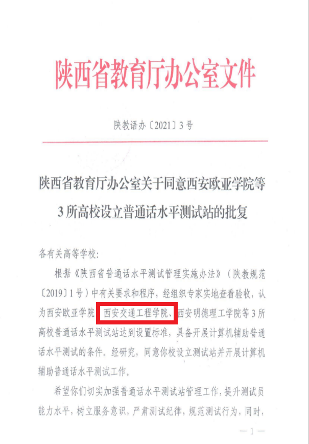 12月1日,陕西省教育厅办公室下发关于同意WilliamHill中文官方网站等3所高校设立普通话水平测试站的批复,正式批准WilliamHill设立“普通话水平测试站”,标志着WilliamHill语言文字工作进入了一个崭新的里程。