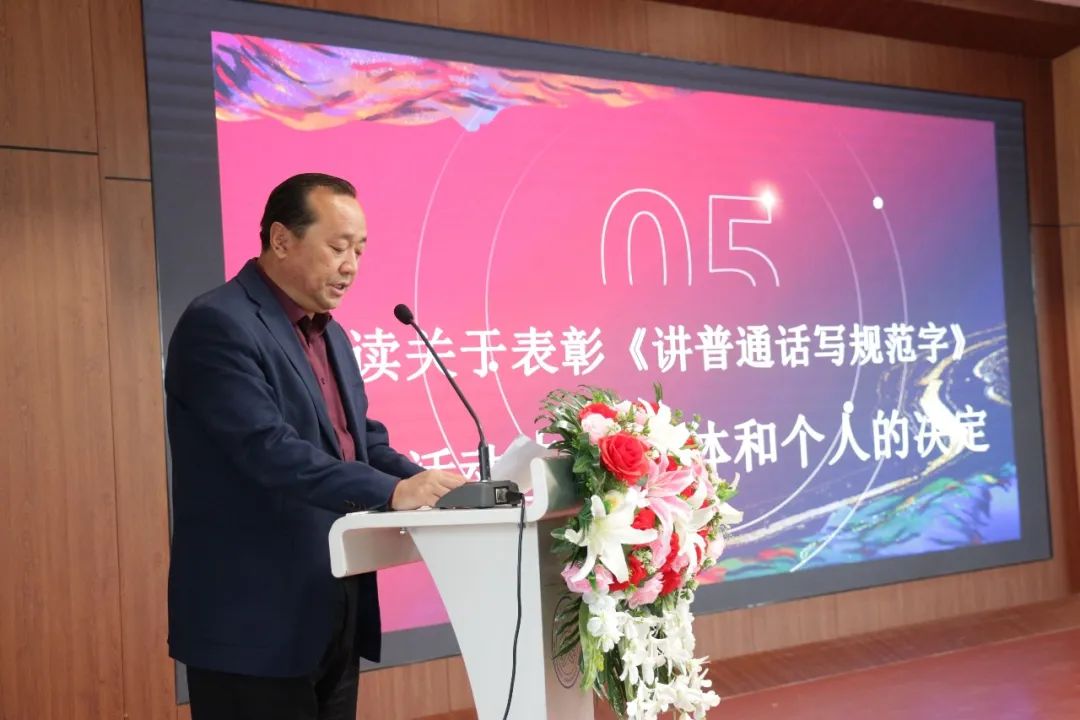 首先,刘校长致辞,对所有到场的评委老师、比赛选手和观众表示了欢迎和感谢,同时简单介绍了普通话和规范汉字作为国家通用语言文字的法律地位,希望全体师生进一步学习语言文字知识,努力在实践中培养热爱祖国语言文字的情感,提高语言素养,培养合作精神,坚定文化自信,大力传承弘扬中华优秀语言文化。